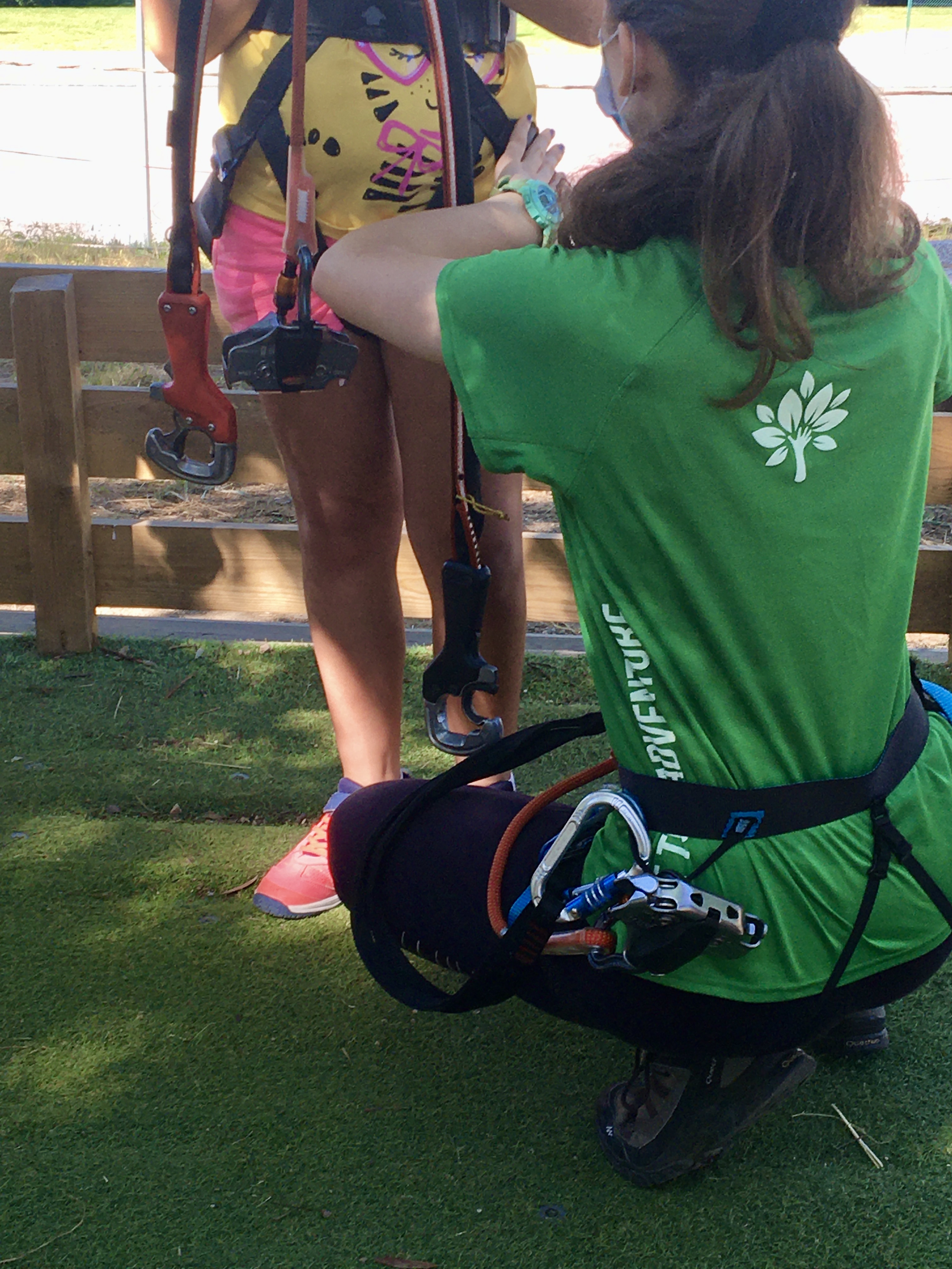 A expectativa é imensa e, à primeira vista, quase parece defraudada. Não parece assim tão difícil, pensamos nós. Veremos. A Ema e o Rodrigo têm 10 anos e também vão experimentar pela primeira vez. As mães ficam a supervisionar. Mãos desinfectadas, deixamos os pertences numa caixa, mas quem vai em grupo tem uma área exclusiva, com mesa e bancos para descansar e comer qualquer coisa sempre que apetecer. Está tudo pensado para se passarem 2 a 3h bem agradáveis, com a cabeça só ali e o corpo a salvo de qualquer imprevisto. O equipamento permite isso, vestem-nos uma espécie de fato de alpinista com dois mosquetões e uma roldana, que aprendemos a usar, e o sistema clic-it passa a ser a chave de toda a experiência.