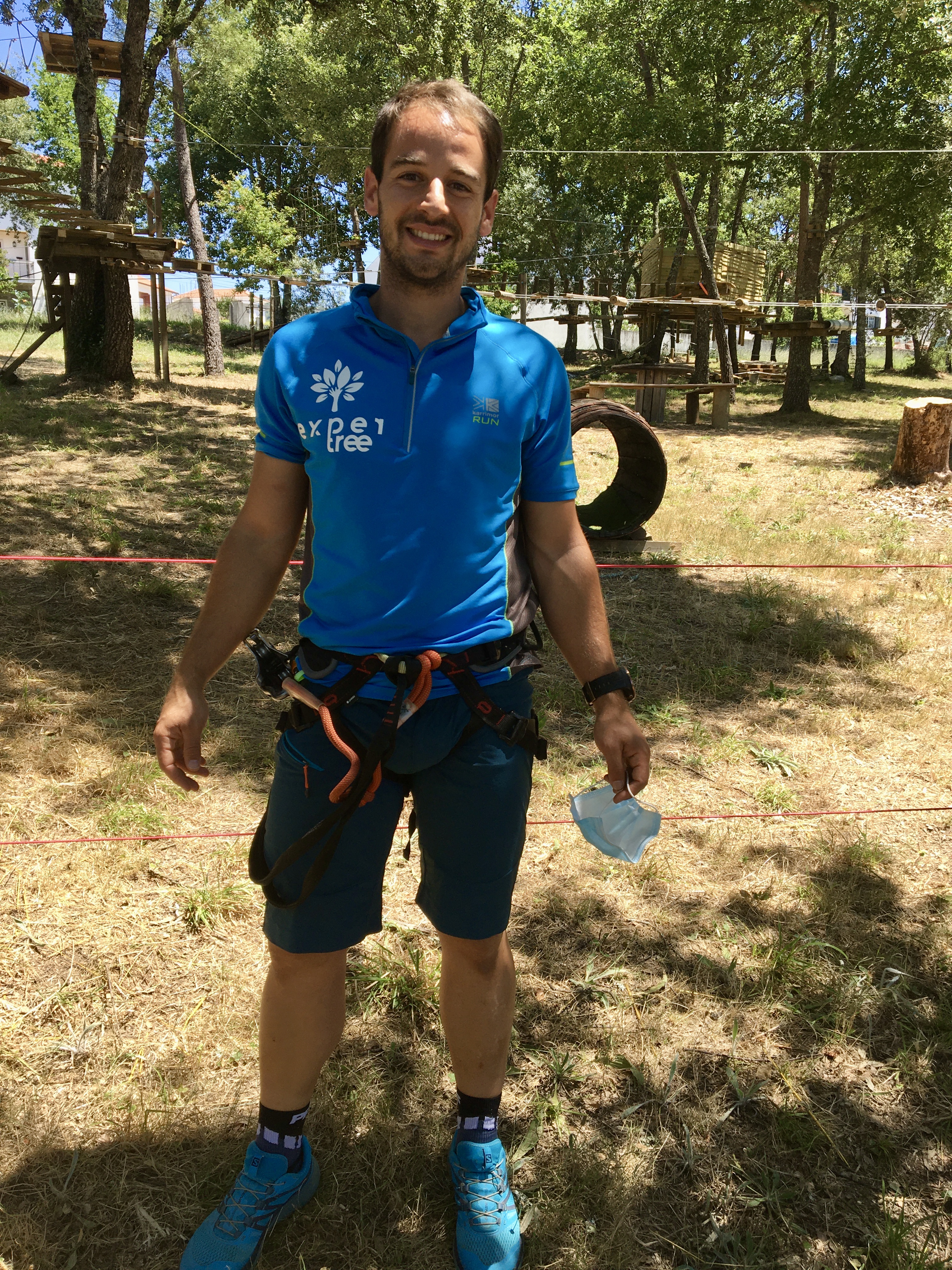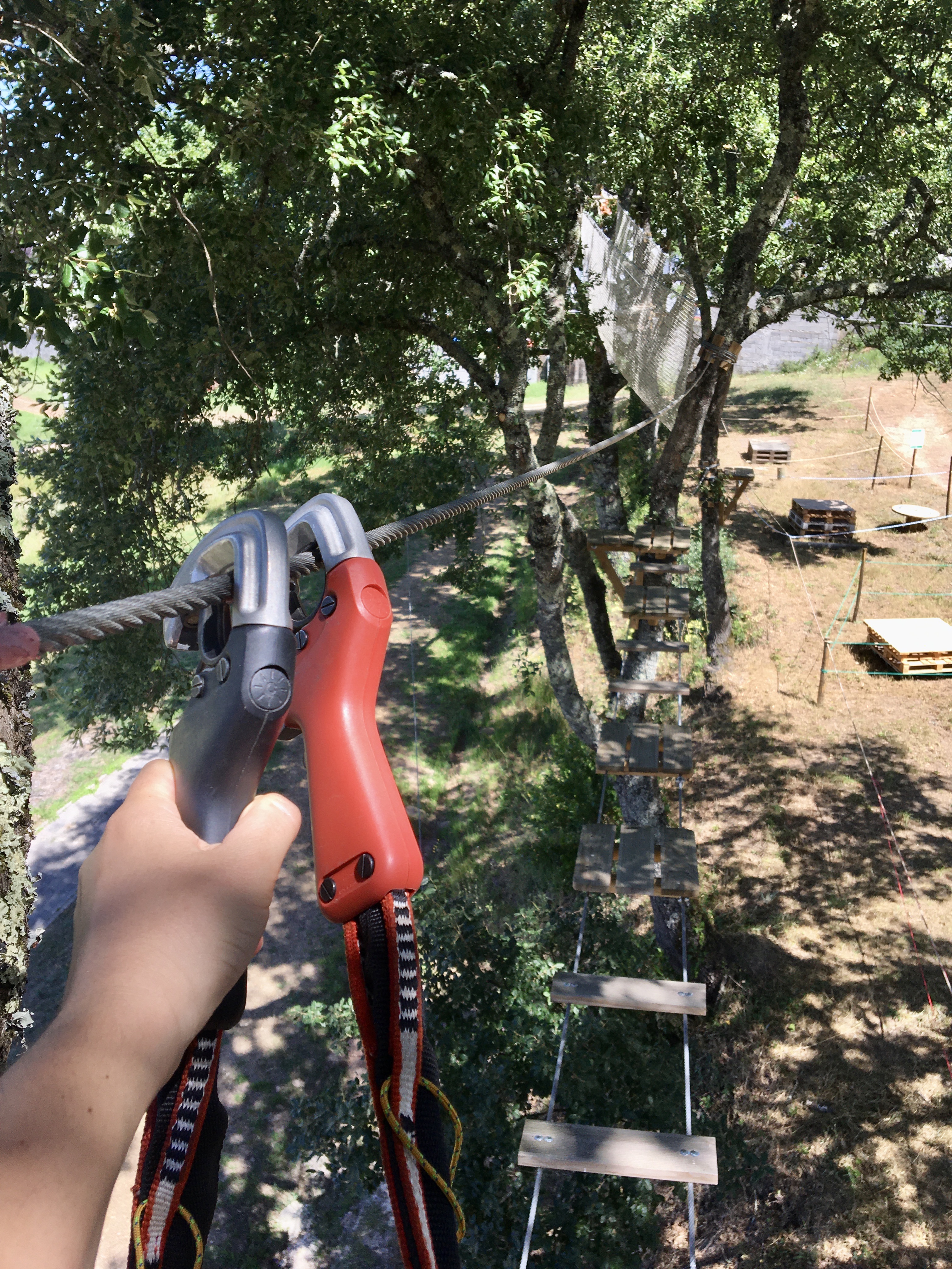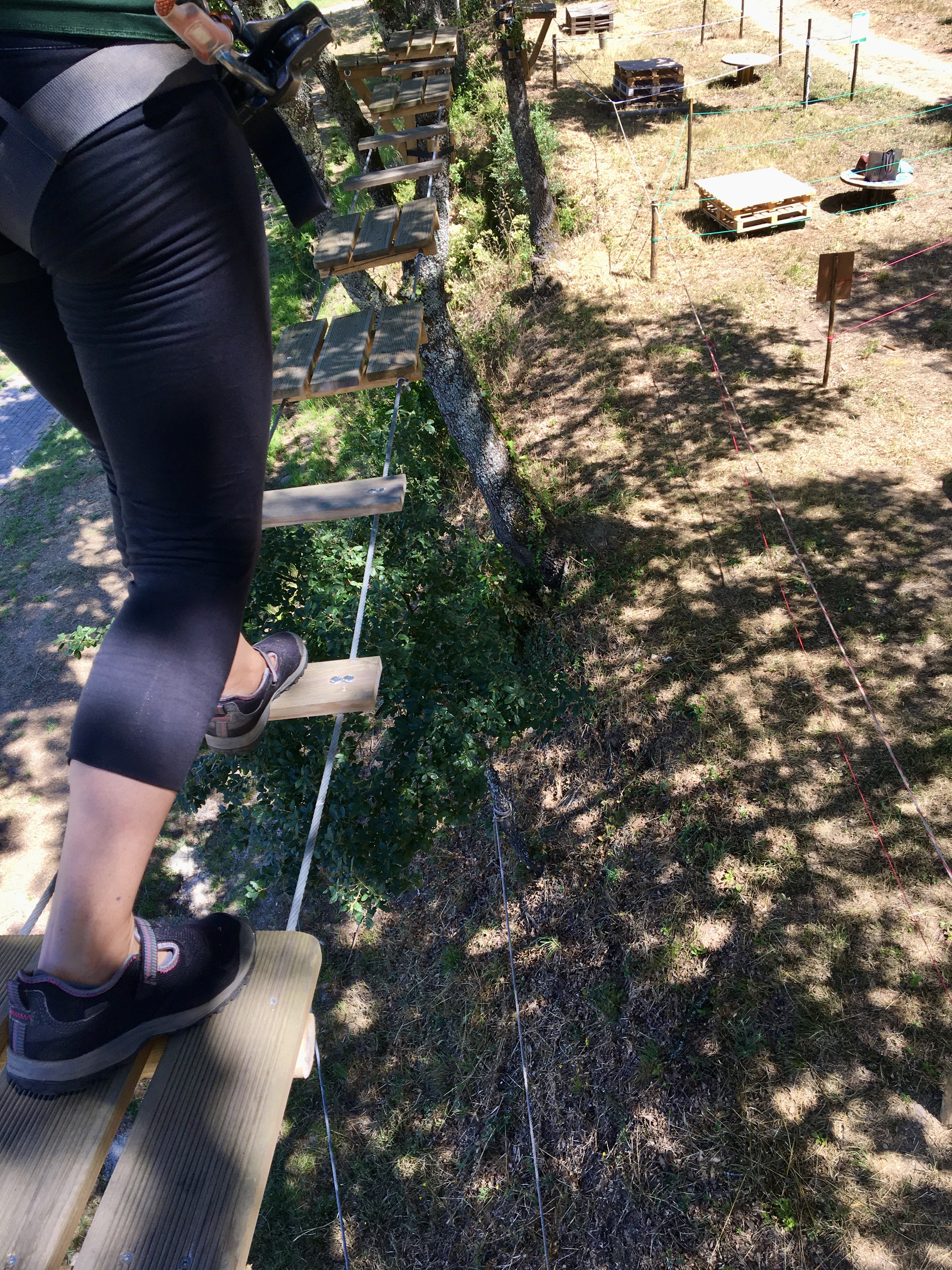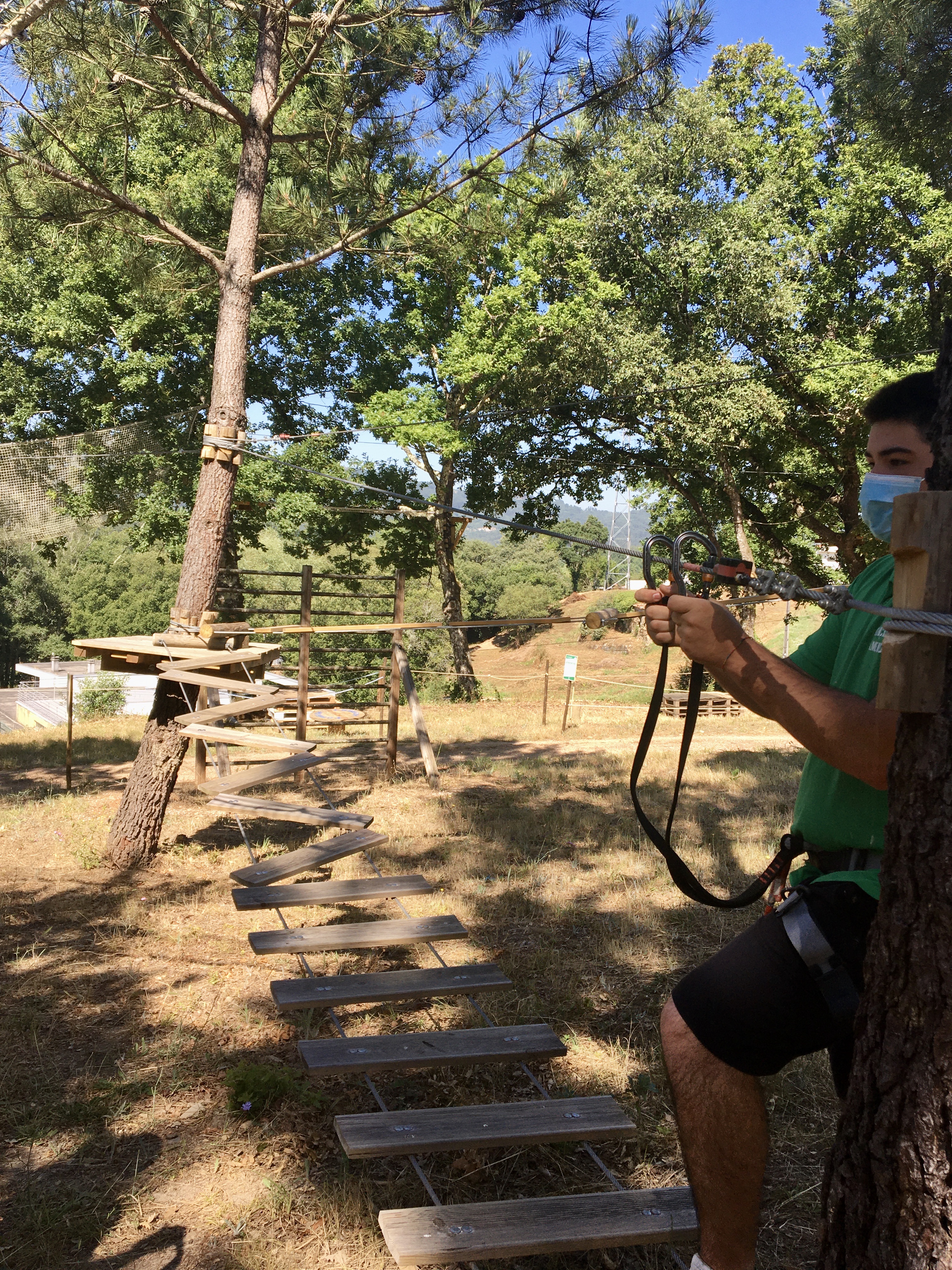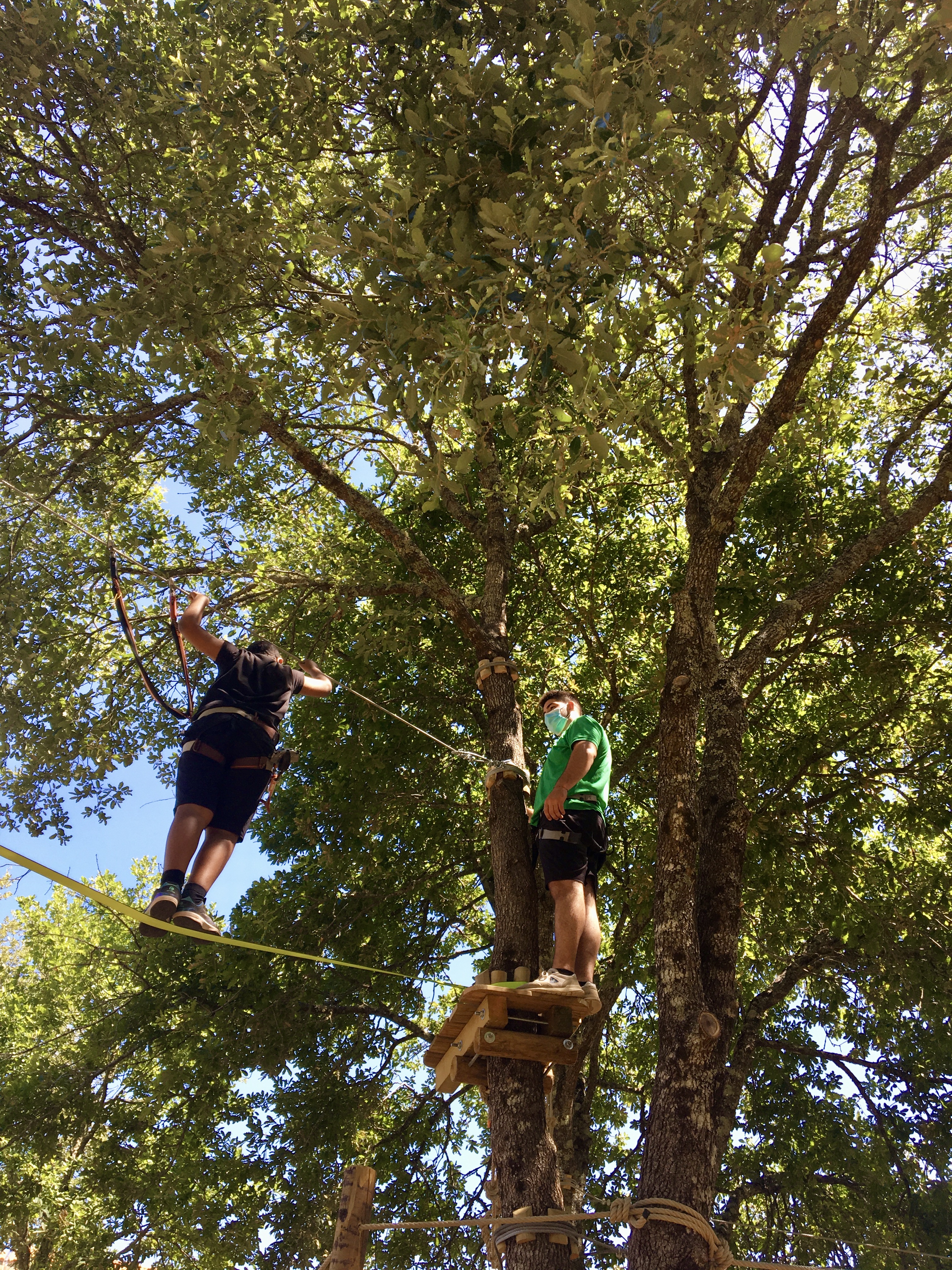 Na travessia em rede, o Rodrigo tem dificuldades. Confirmamos que às vezes é mesmo difícil avançar na corda bamba, mesmo sabendo que vamos parecer uma espécie de Homem Aranha. Os percursos são progressivos, começam nos mais baixinhos e vão subindo, às vezes pode ser preciso dar uma mão, explica Pedro. Sempre com uma voz serena e tranquilizante acalmou os nervos do participante mas ele acabou mesmo por descer da árvore, e deixar a coisa por ali. Foi uma questão de insegurança mas é importante que quem ache que, por exemplo, vertigens não permitem participar, entenda que há esses diferentes graus de dificuldade e também que se pode desistir a qualquer momento, afinal não é uma competição. É suposto ser um momento divertido, em família ou entre amigos ou colegas de trabalho. O equipamento é bem seguro, há uma psicóloga na equipa e Pedro Mendes, além de formação em Ciências do Desporto, PNL e Coaching teve 7 anos de experiência em arborismo noutra empresa.